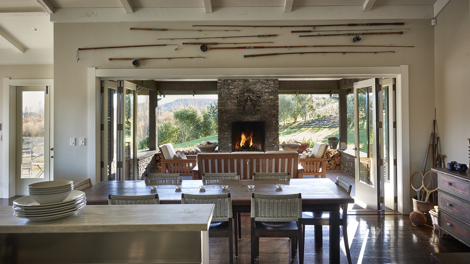 With easy outdoor-indoor flow from the kitchen and living-dining area to the outdoor fireplace and lounge seating.