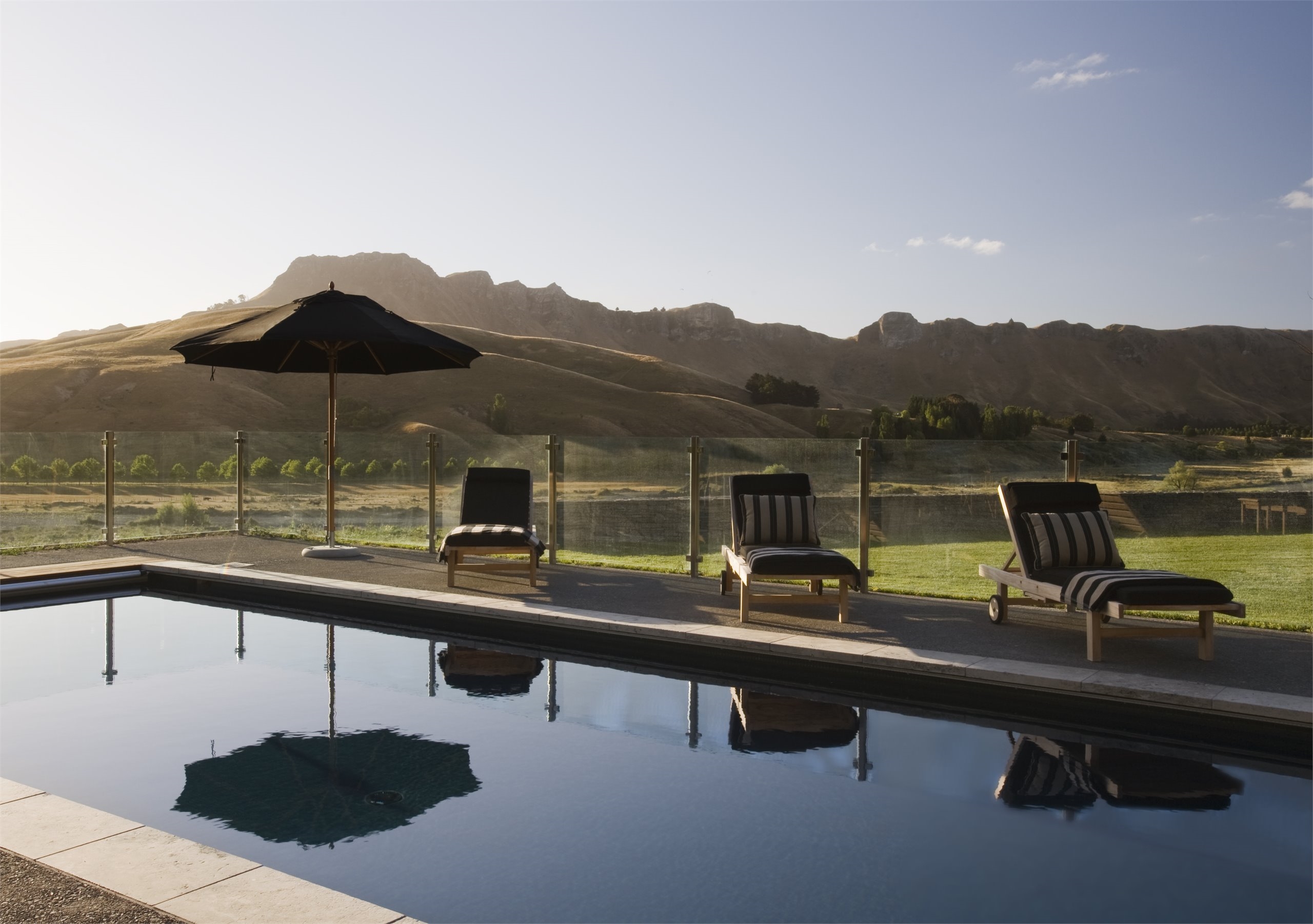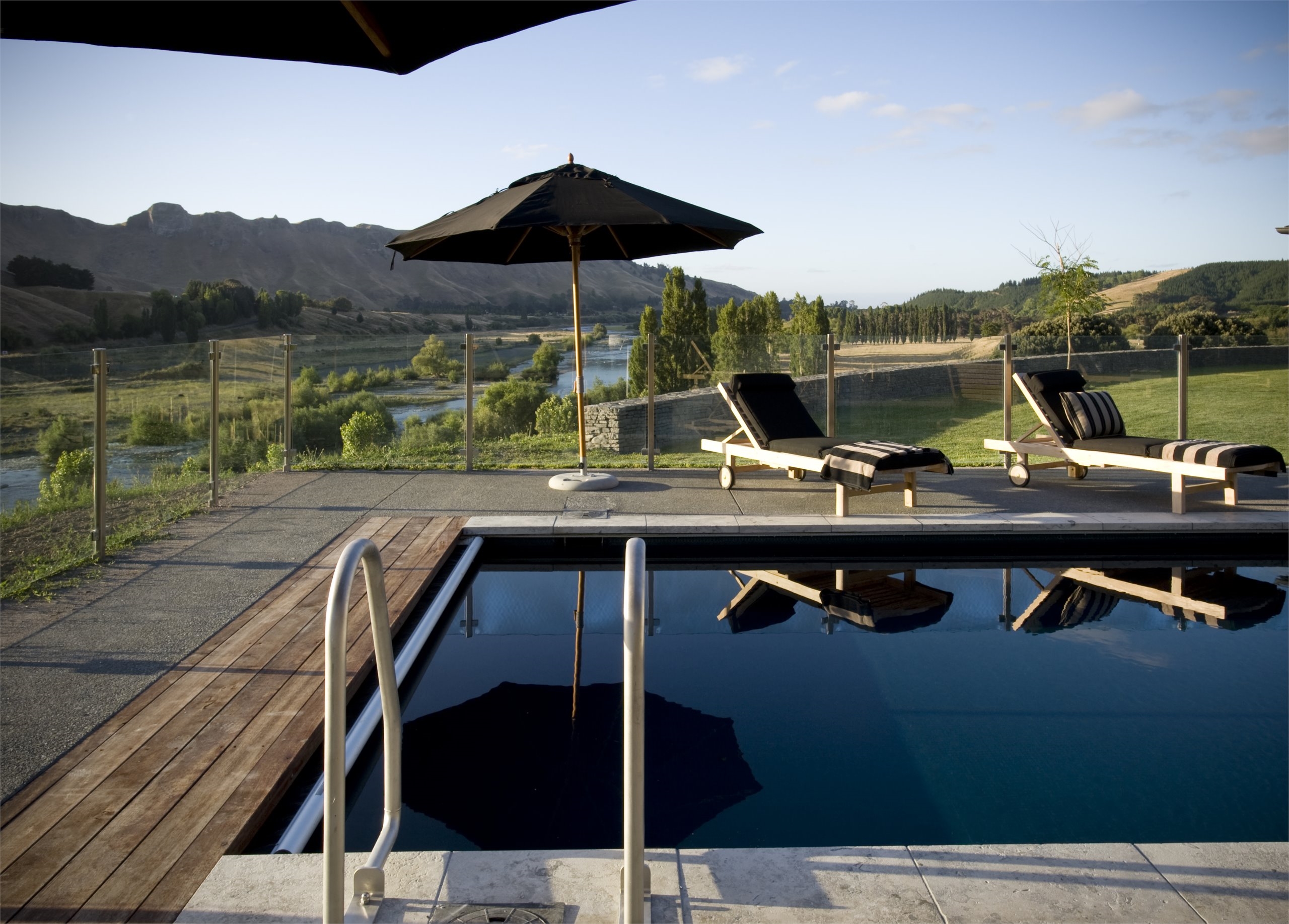 A sunny and spacious pool area looks out to the beautiful Tuki Tuki River and up to Te Mata Peak.